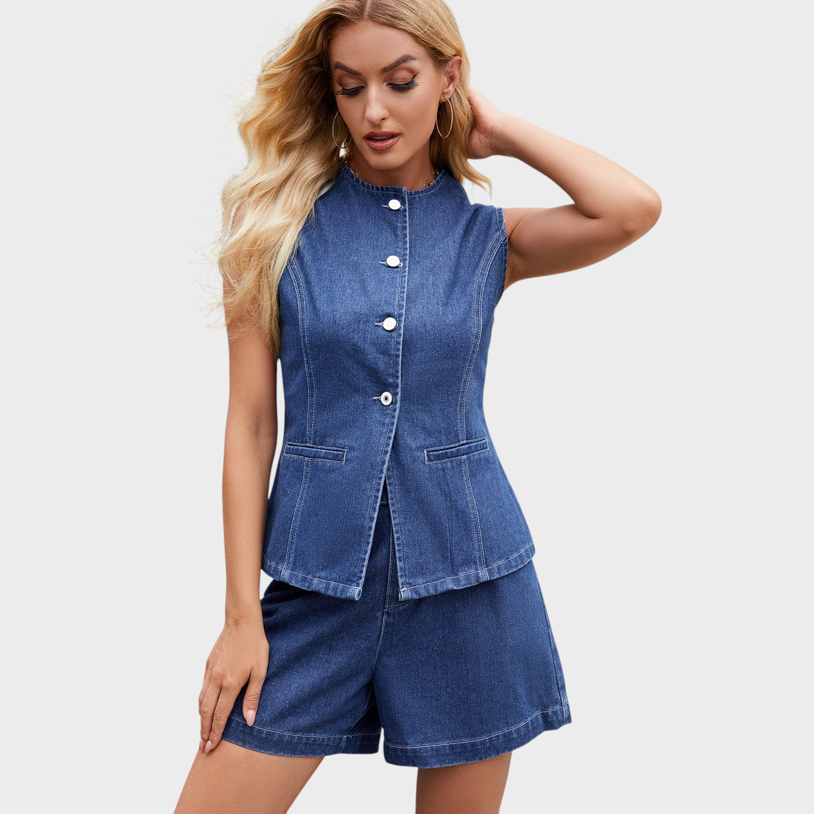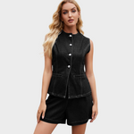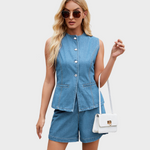 Este conjunto moderno une frescura e elegância numa só peça. O colete estruturado com botões frontais combina na perfeição com os calções de corte descontraído, criando um equilíbrio entre estilo clássico e atitude contemporânea.